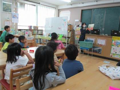 司書の先生に図書室の使い方を教えてもらい、はじめて本を借りました。