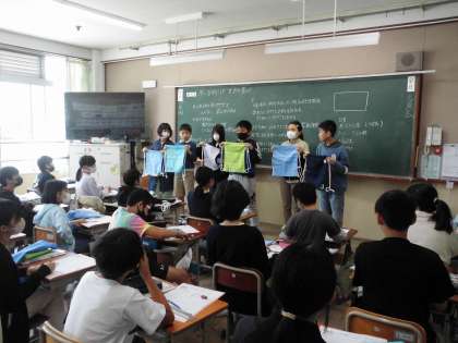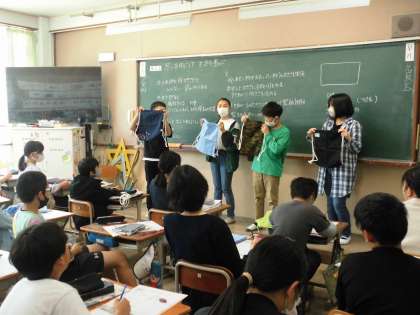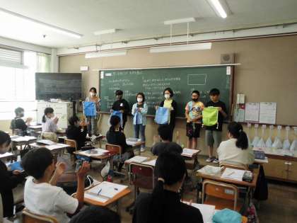 出来上がったナップザックをみんなに披露しました。なかなかよくできていますね。さすがです。