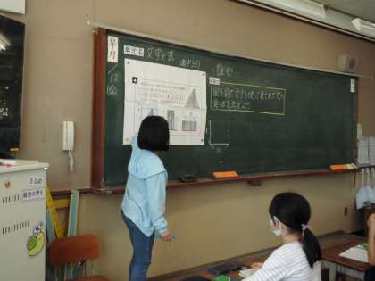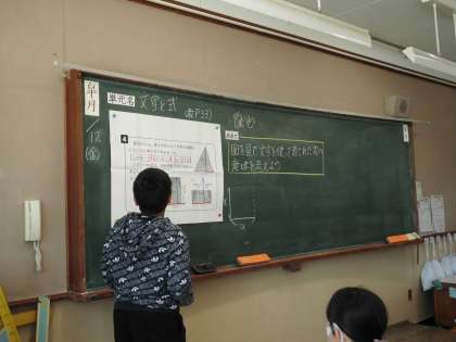 文字と式の学習です。図を見て文字を使って表された式の意味を考えました。どのように考えたのかを説明しました。