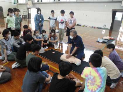 伏見消防署の方に来ていただき人形を使って心臓マッサージの仕方やAEDの使い方について教えていただきました。