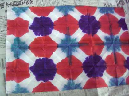 版紙を折ってから,染めました。開くと,それぞれ素敵な模様ができました。