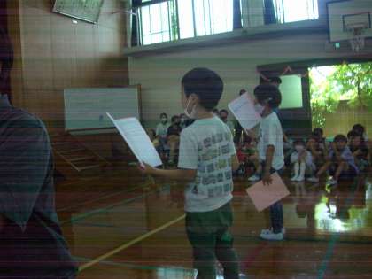 1年生を迎える会であおぞらクイズをしました。1年生に喜んでもらえて,とても嬉しかった様子でした。マイクを使って,上手にクイズを出すことができました。