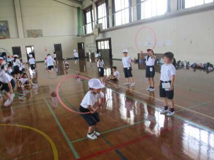 輪を使って、ぐるぐる回したり、転がしたり、跳んだりと元気に活動していました。