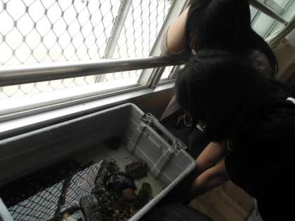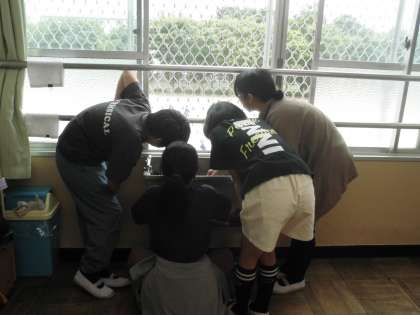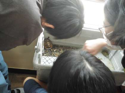 教室でお世話をしている亀を見ています。「今日も元気かな」