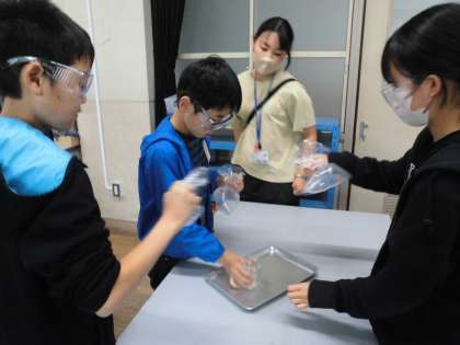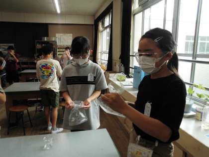 「体のつくりと働き」の学習です。吐く息の中に二酸化炭素があるのかどうかを石灰水を使って確認する個人実験をしました。