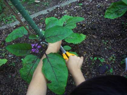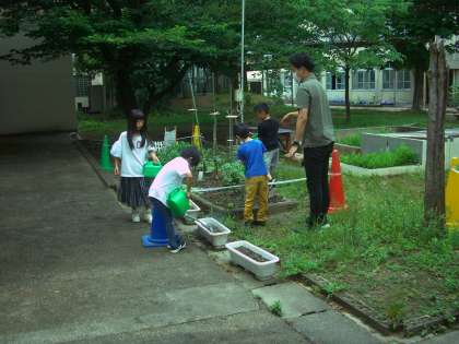 毎日,水やりを頑張っています。今日はみんなで「なす」を収穫しました。これからも水やりを頑張って,大きく育てていきたいと思います。