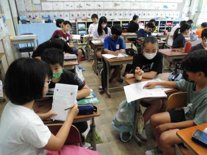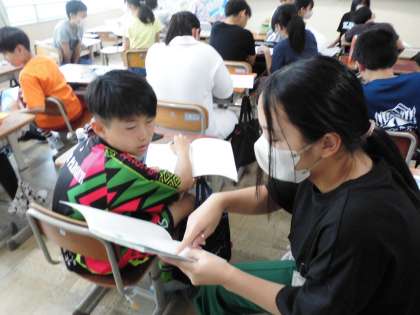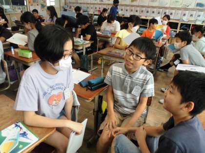 「分数×分数」の学習です。分数を使って割合を表す学習をしました。割合の学習の内容を確認し合いました。