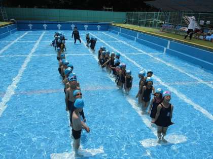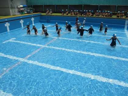 水の中を大股で歩き、ワニ歩き、カニ歩きをして水に慣れました。