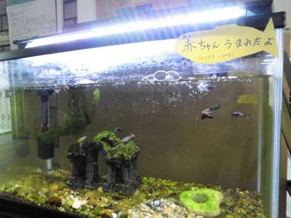 玄関入り口に置かれている水槽のグッピーが赤ちゃんを産みました。可愛いです!