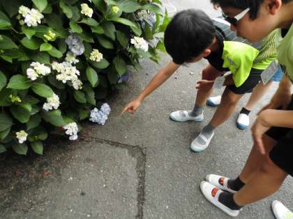 学校のアジサイが美しく咲いています。足元に一輪、かわいいかたちのはなを見つけました。