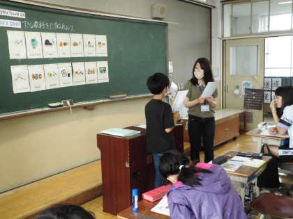 「好きな教科は何ですか?」と尋ねあいました。続きに、「好きなスポーツは?」「好きな色は?」「好きなアニメは?」など応用してたくさん会話のやり取りを楽しむことができました。