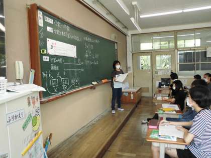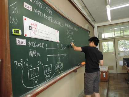 「分数÷分数」の学習です。分数で割る計算の仕方を考え、みんなに説明しています。よく頑張っています。