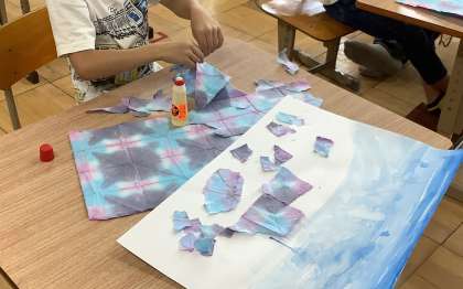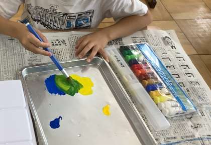 あじさいの色をイメージして,和紙を染めました。その和紙を使ってちぎり絵にチャレンジしました。葉は絵の具で表現しました。黄色と青色が混ざって緑色になることがわかると,歓声があがりました。