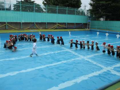 本日の水遊びは,少し水位が上がったので,顔を半分つけて歩く「カニ歩き」からスタートしました。その後,もぐったり,浮かんだりする活動に取り組みました。ペアでの水中じゃんけん練習の後は,みんなでじゃんけん列車をしました。顔をつけるのが苦手な子も,じゃんけんとなると楽しく活動していました。また,伏浮きの姿勢の練習も始めました。来週も晴れますように!