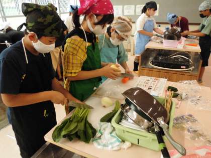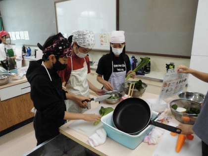 調理実習です。メニューは「いろどりいため」と「青菜の油いため」グループで計画立てていた通りに手際よく取り掛かっています。おいしく作ってね。