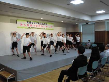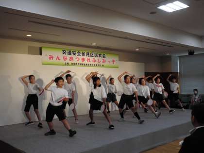 交通安全伏見区民大会で民舞を披露しました。元気いっぱいの掛け声とリズムに乗った動き、さすがでした。みんなよく頑張ったね。
