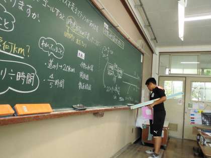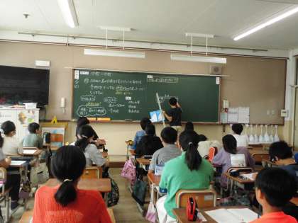 「分数÷分数」の学習です。どのように考えたのか、関係図や数直線図に書いて説明しました。みんな真剣に話を聞いています。