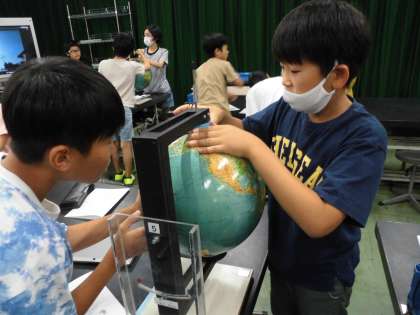 最後に地球儀を使って日本の位置を確かめ、光源と地球儀を使って夏や冬の太陽の動きを確かめました。季節によって太陽の高さや日照時間が変わるのはなぜかを考えました。