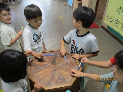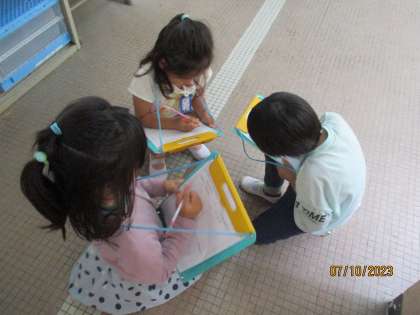 音楽の授業で、身のまわりで聞こえる音探しをしました。「学校の中にはどんな音が聞こえるかな?」と問いかけると、「クーラーからボーボーって音がする。」「先生!ここをたたくと、コンコンコンって音がするで!」「水そうからは、ピチャンピチャンっておとがする〜。」等とたくさんの音を見つけることができました。次回は、集めた音で音楽づくりをしていきます。