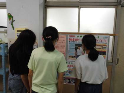 熱中症についてのポスターを見ていますね。毎日暑いので気をつけようね。
