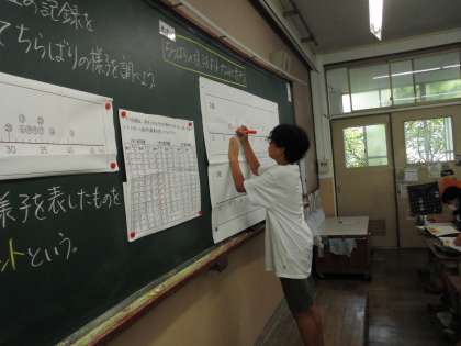 「資料の調べ方」の学習です。ドットプロットに整理したものをみんなで確認しました。