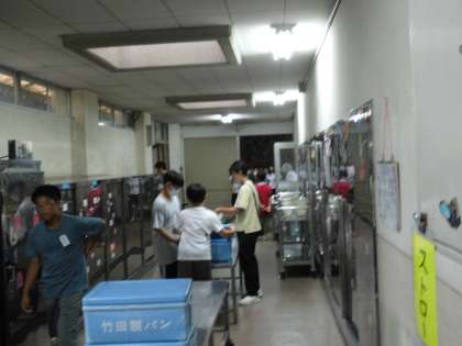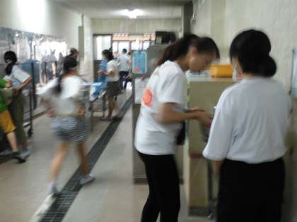 サービスホールで給食の食器返却の補助や声掛けをしています。ありがとうございます。今日もおいしくいただきました。ごちそうさまでした。