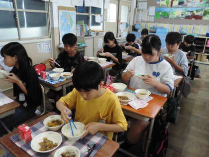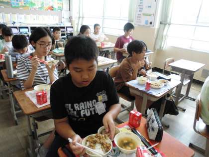 「なごみ献立」です。万願寺とうがらしと賀茂茄子、こんにゃくのごまみそあえ。みょうがのすまし汁、サバのそぼろどんぶりの具。暑い夏にサッパリとおいしくいただけるご飯によく合うメニューでした。おいしくいただきました。