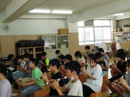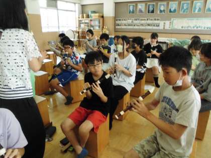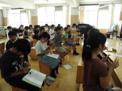 リコーダーの練習です。夏休みに自分で練習していかなくてはいけないので、みんなで楽譜の確認と指使いやメロディを確かめました。頑張って練習してくださいね。