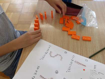 ドミノの立て方を考えました。うまく並べないと倒れてくれません。どうやったらドミノが続いて倒れるのか試行錯誤しました。