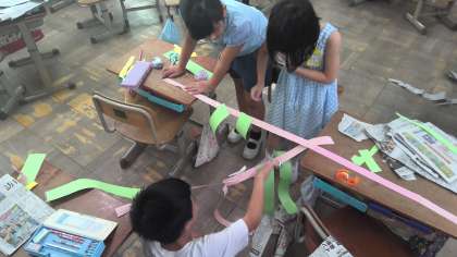 紙のつなぎ方を工夫して、おもしろいつなぎ方や形を見つけました。