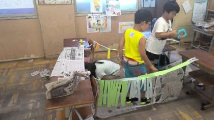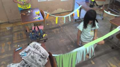 長くつないだ紙にさらに紙をつるして飾りをつくっていました。