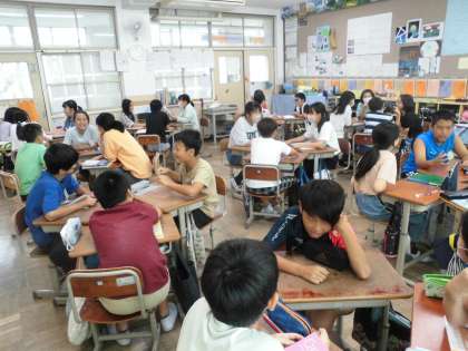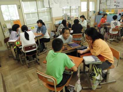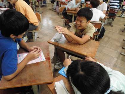 始める前は「しゃべれるかなぁ」とちょっぴり不安そうで、メモを見ながら伝え合っていましたが、気が付けば、どのグループも笑顔いっぱい!身振り、手ぶりで伝え合っていました。