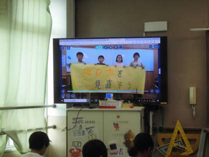 児童会から、9月の生活目標を知らせる動画が届きました。みんな真剣に見ています。今月は「遊び方をみなおそう」です。