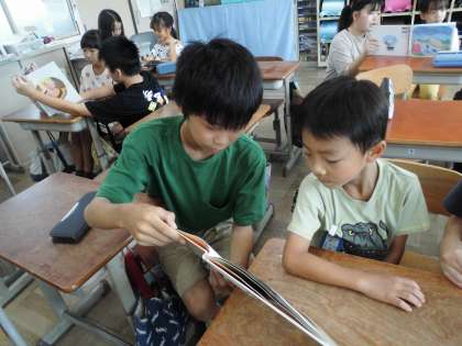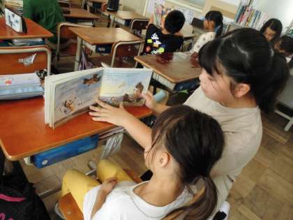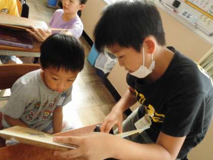 1年生にやさしく読み聞かせをする素敵な6年生!絵本を指さして楽しそうにおしゃべり、笑顔がいっぱいでした。