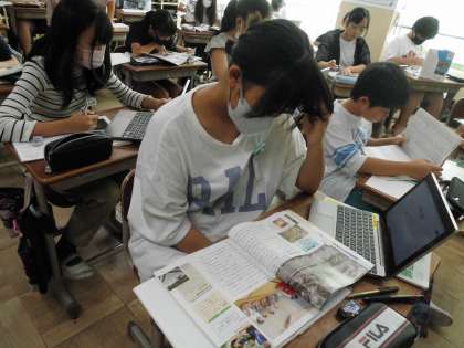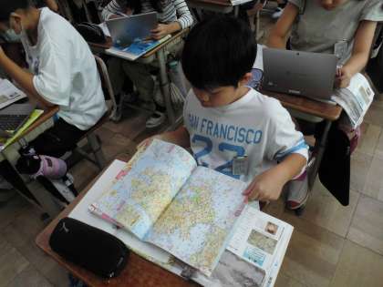 「今に伝わる室町文化」の調べ学習です。自分が調べたことを交流していますね。地図で場所の確認をしていますね。それぞれに自分でどんどん調べています。よく頑張っています。