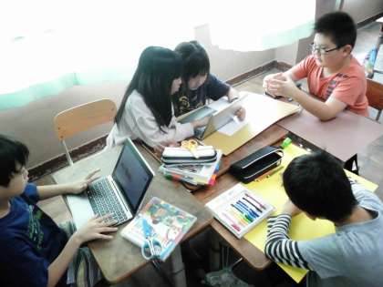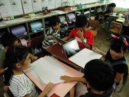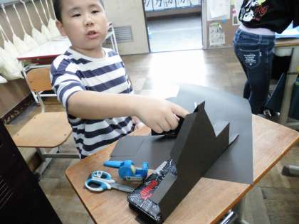 図工の時間に教室のかべ飾りをつくりました。子どもたちが作りたいものを考えて、自分たちで班を作り、思い思いのものを作っていました。一緒に作ったり役割分担したりするなど協力しながら楽しく作っていました。