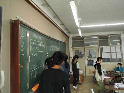 今日は2つの数量の関係が比例しているという問題で、グラフで表してみました。そのためにみんなで2つの数量を整理しました。