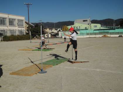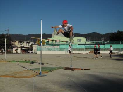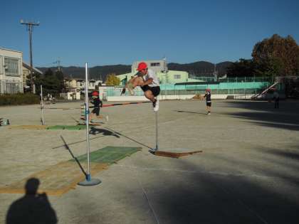 走り高跳びで新記録に挑戦しています。みんなで背中を押し合って進めています。仲間への声掛けもバッチリ。応援が素敵でした。
