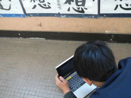 休み時間に、教室にあらわれたクモをタブレットを使って観察している人がいました。随分熱心に見ていますね。