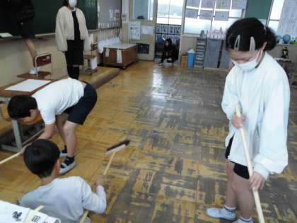 家庭科の時間にお掃除の学習をし、みんなで大掃除をしました。普段の掃除時間ではできないような所も、すみずみまできれいにしてくれました。「いつもより少し長い時間になっただけで、こんなにきれいになるとは思わなかった。」とか「みんなで協力したらあっという間だった。」と振り返りの言葉もあり、あっという間に授業時間が過ぎました。冬休みにまた学習したことを生かして、おうちをピカピカにしてくれたらと思います。