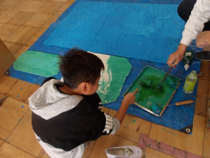 2月にある小さな巨匠展の準備をしました。伏見中支部の小学校の育成学級で一つの作品を作り上げます。また、桃山中学校のブロックで合同の作品を作り上げます。その土台づくりをしました。今年のテーマは「イッツアスモールワールド」に決まったので、海の土台を作りました。3校の作品が一つの作品になるのが楽しみですね。