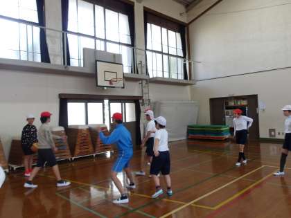 6年の交流学習で体育をしました。バスケットボールをしました。初めて取り組みましたが、一生懸命ボールを友達にパスしたりゴールしたりしていました。