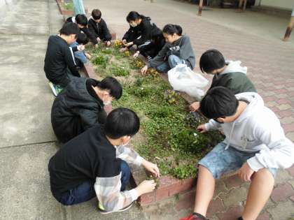 今年初めての活動は、花壇に所狭しと咲いていた雑草を抜いたり、各クラスに配るクイズを考えたりしました。