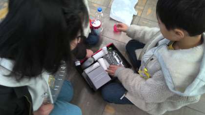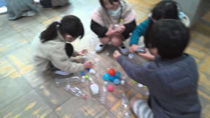 今日は班でどんな遊びを作るか、材料を触りながら考えました。