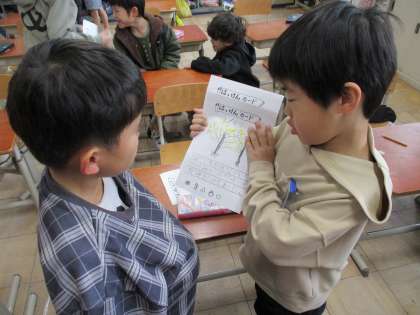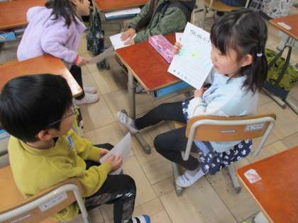 冬見つけをしました。自分の書いたカードを見せ合って、学校で見つけた冬を友だちに紹介することができました。
