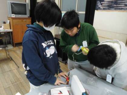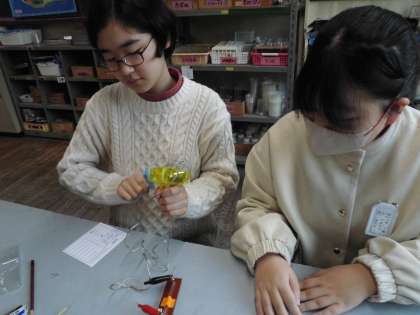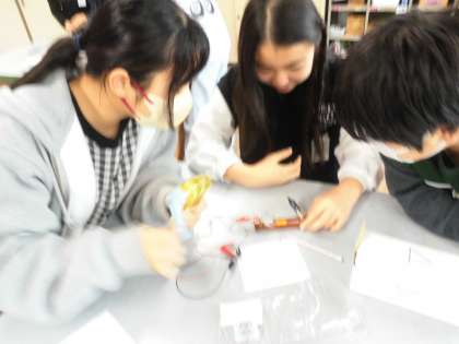手回し発電機を使って、発光ダイオードに明かりがつくか、オルゴールがなるか、などを調べました。