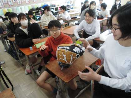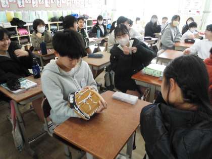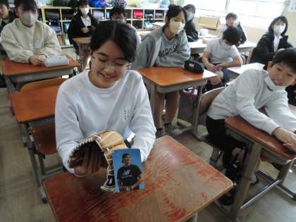 大谷選手からのプレゼントのグローブをみんなで触ってみました。