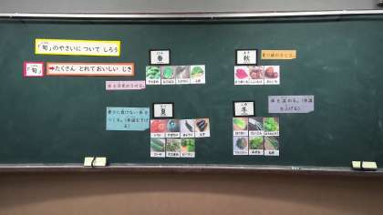 栄養教諭の阿野先生に「旬の野菜」について教わりました。野菜の紙芝居の後、「旬の野菜」クイズに挑戦!学校で育てた野菜は、わかりやすいのですが、それ以外の野菜は、行事献立などを思い出しながら考えていました。旬の時期以外でも、いろいろな方法で栽培され、流通していることも教えてもらいました。