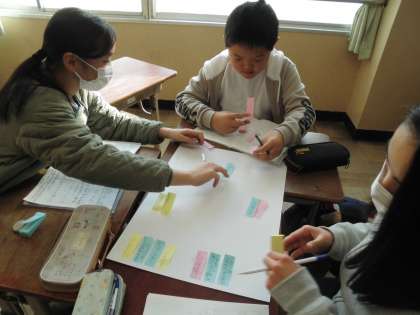 グループで調べたことを整理しながら共有しています。お互いに調べたことを伝え合いました。