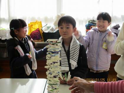 班でどれだけ高く積めるかを競争をしました。50個全部を乗せられた班もあり、楽しむことができました。